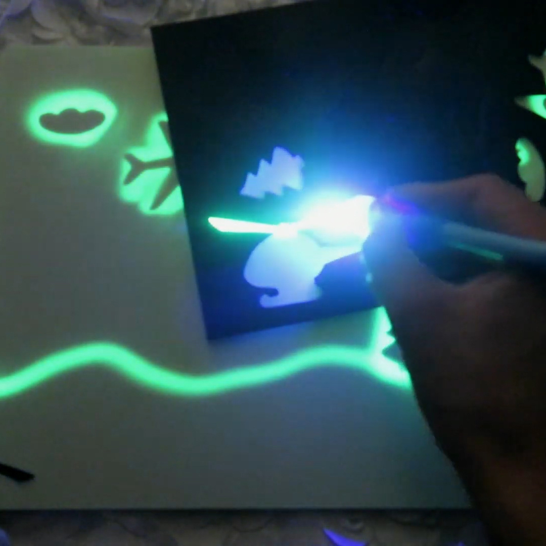 Ручка, она и для того, чтобы рисовать светом на доске, и чтобы писать секретные послания. Ее чернила невидимые, но когда подсвечиваешь фонариком от ручки, то рисунок проявляется. На доске понравилось рисовать всем, рисуем не в темноте, а полумраке.