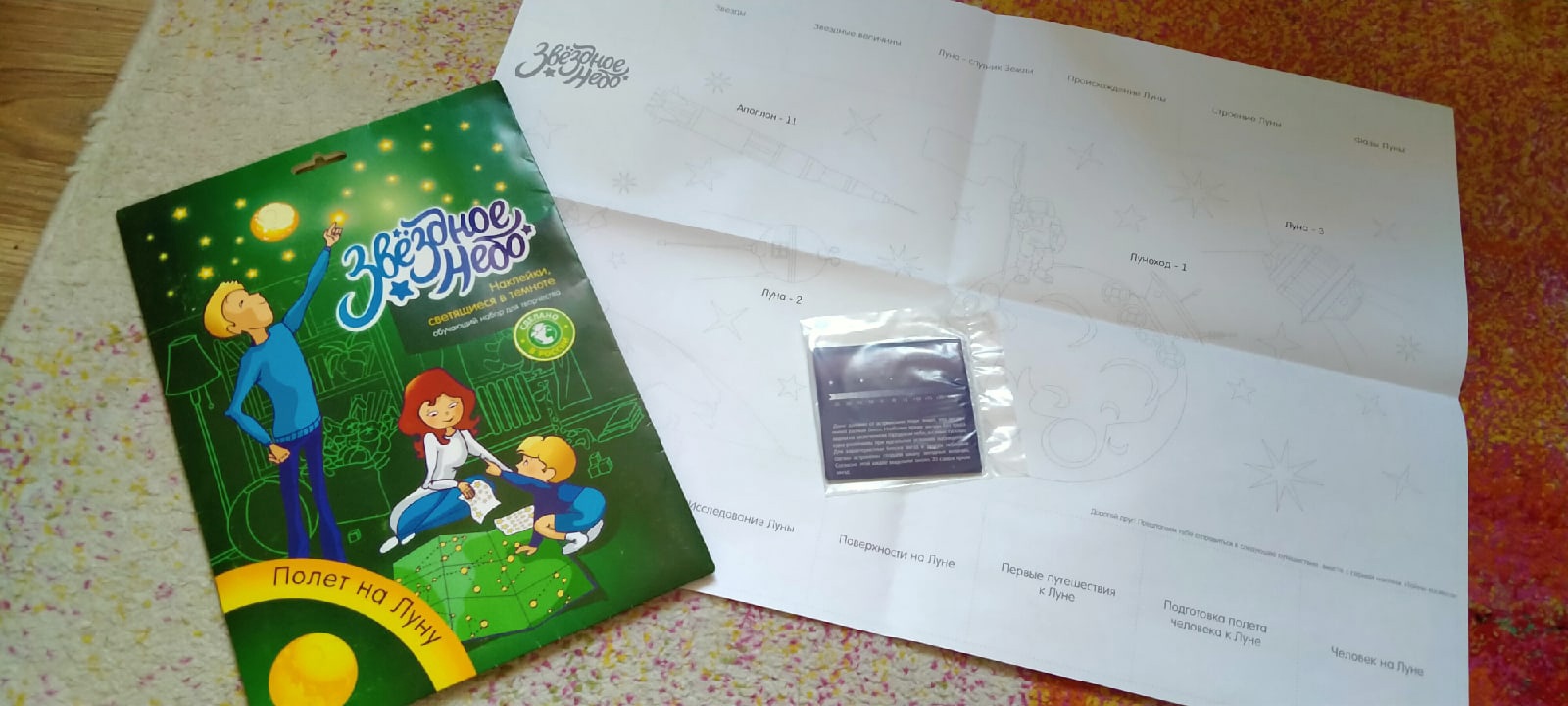 Кроме наклеек в наборе также есть большая карта-раскраска размером А2 и стикеры на карту с интересной информацией о Луне и звездах. Благодаря этому дополнению к наклейкам дети смогут проявить свое творчество и узнают много нового о звездном небе. Рекомендую набор к покупке.