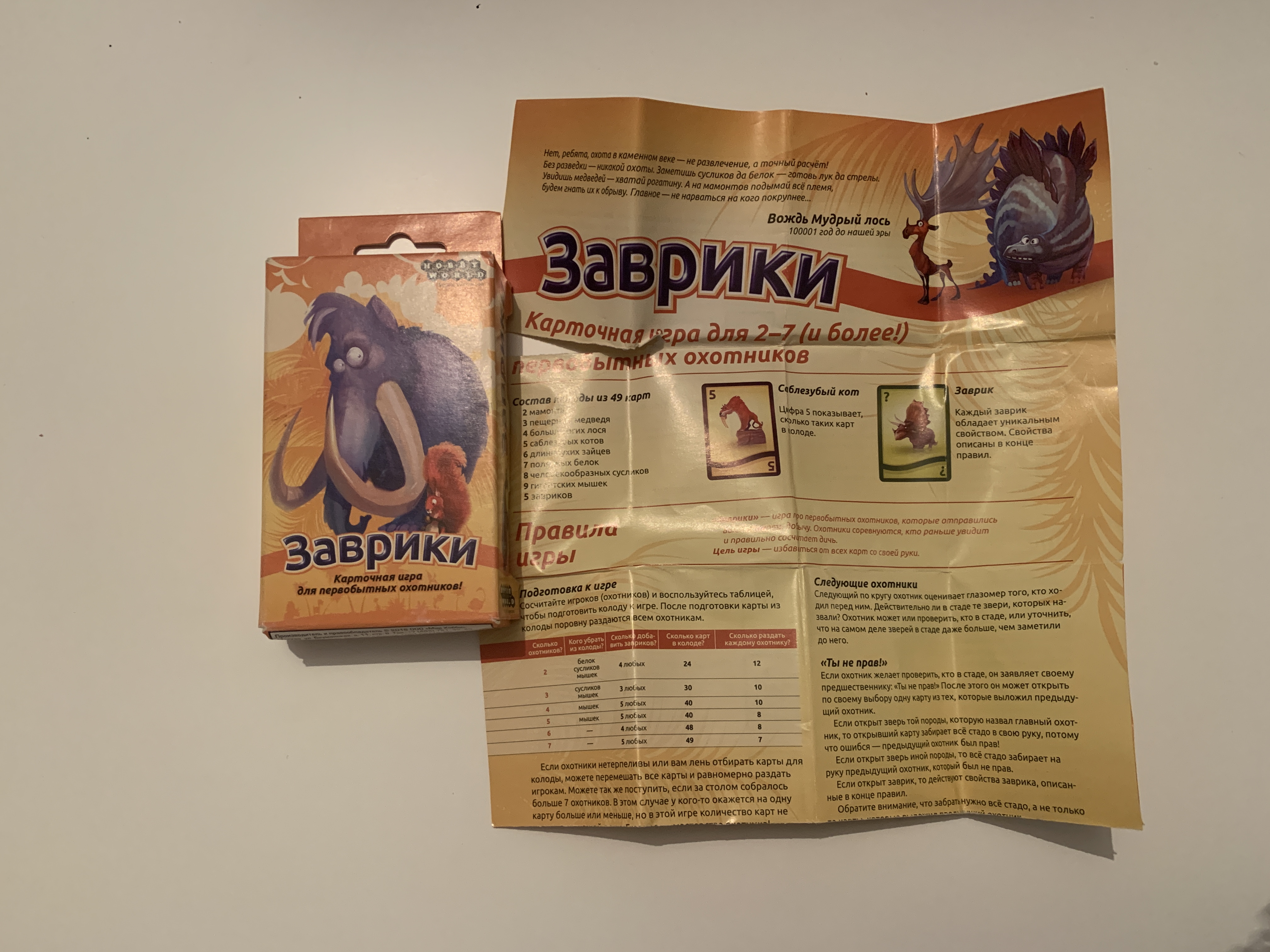 "Заврики" – это весёлая настольная игра, предназначенная для 2-7 игроков в возрасте от пяти лет и старше (5+), в основе которой лежит всем известная игра "верю — не верю". Купив предложенную игру, участники переместятся в каменный век и перевоплотятся в первобытных охотников на мамонтов и других доисторических животных.