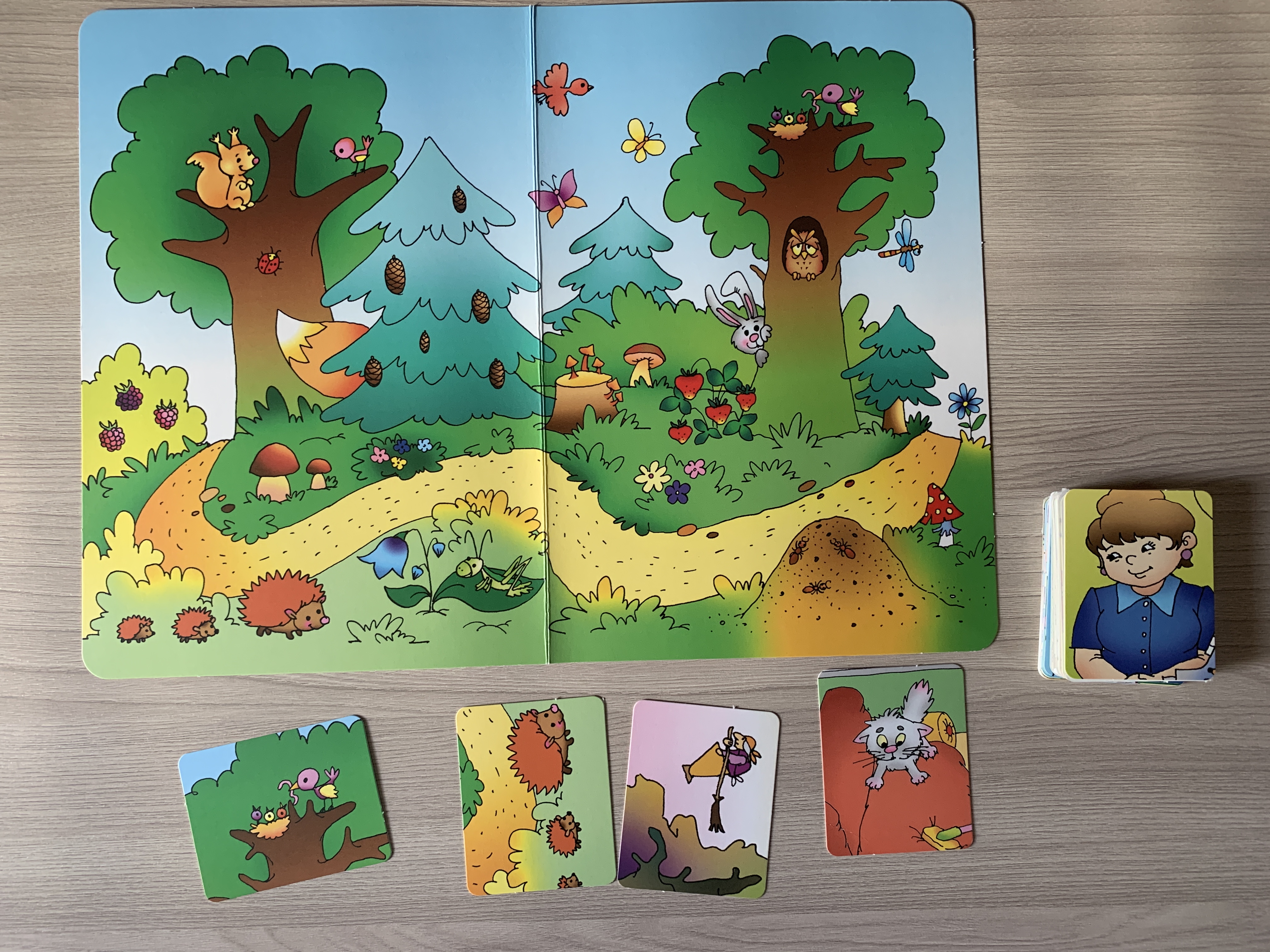 - 40 маленьких карточек, на которых изображены различные фрагменты сюжетных картинок, при этом каждой большой сюжетной картинке соответствует 4 карточки с фрагментами;