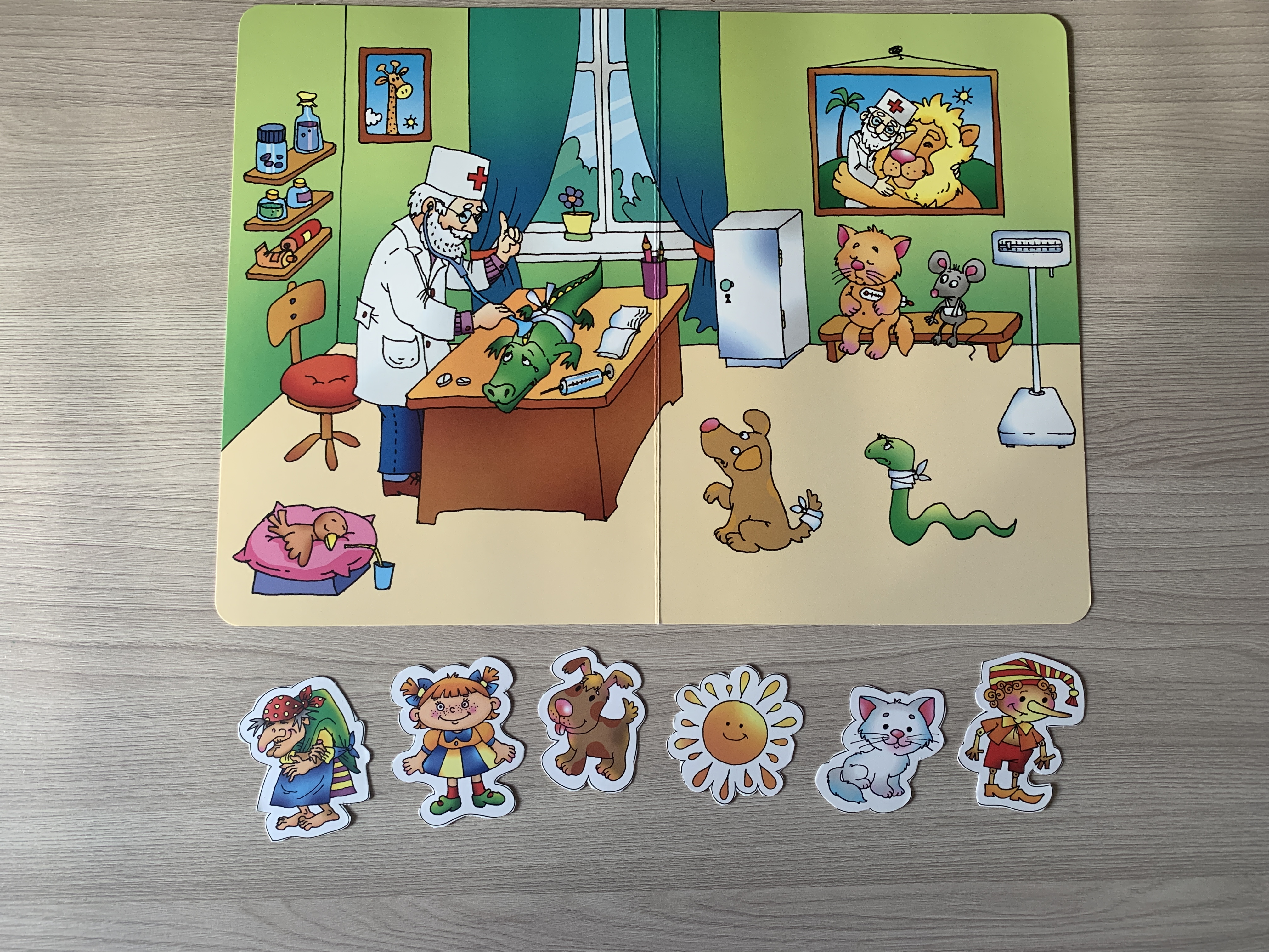 - 10 больших игровых полей формата А3, на которых изображены сюжетные картинки, например: «на приёме у врача», «детская площадка летом», «день рождения» и другие);