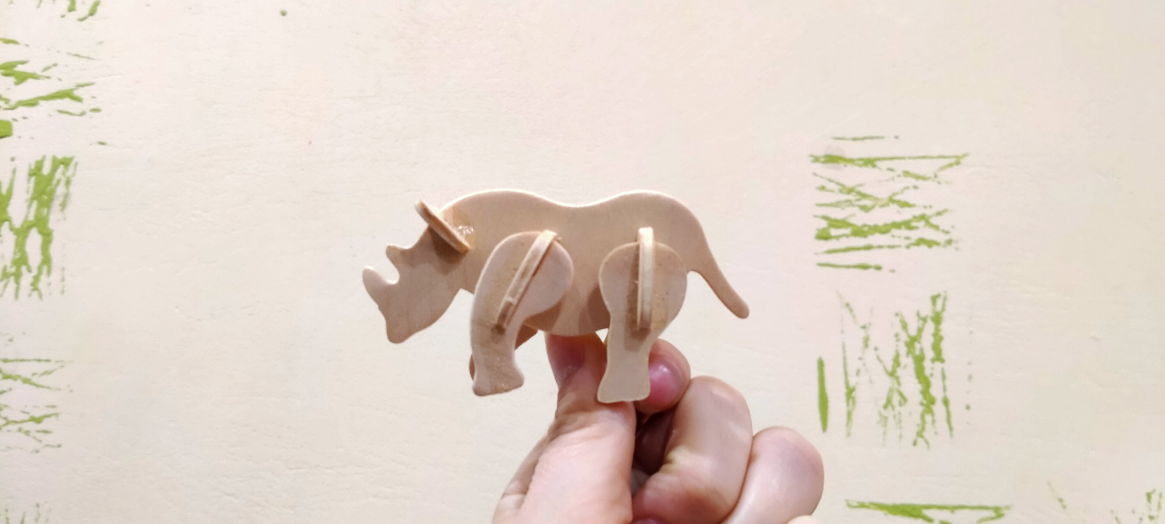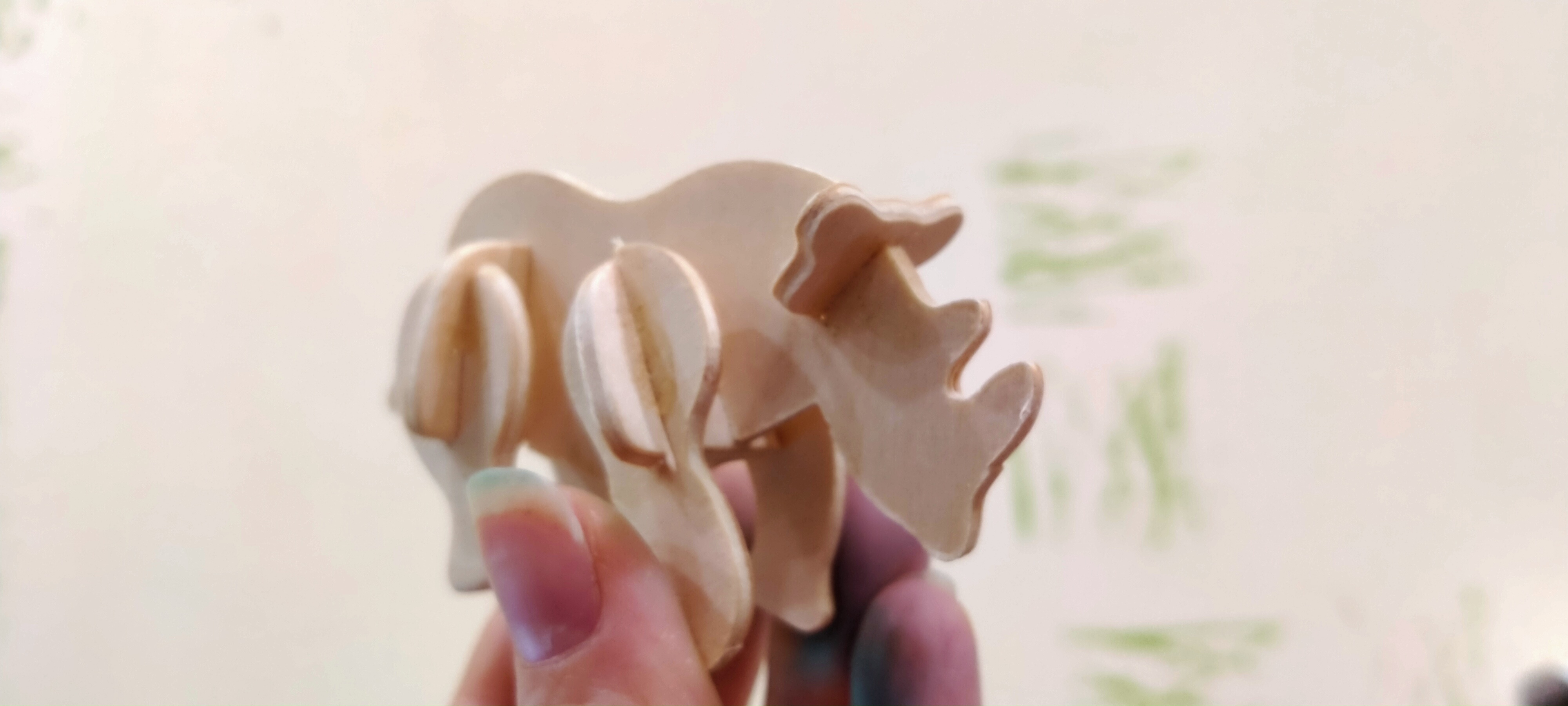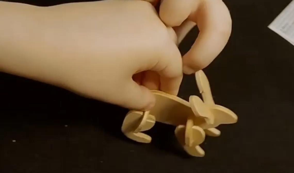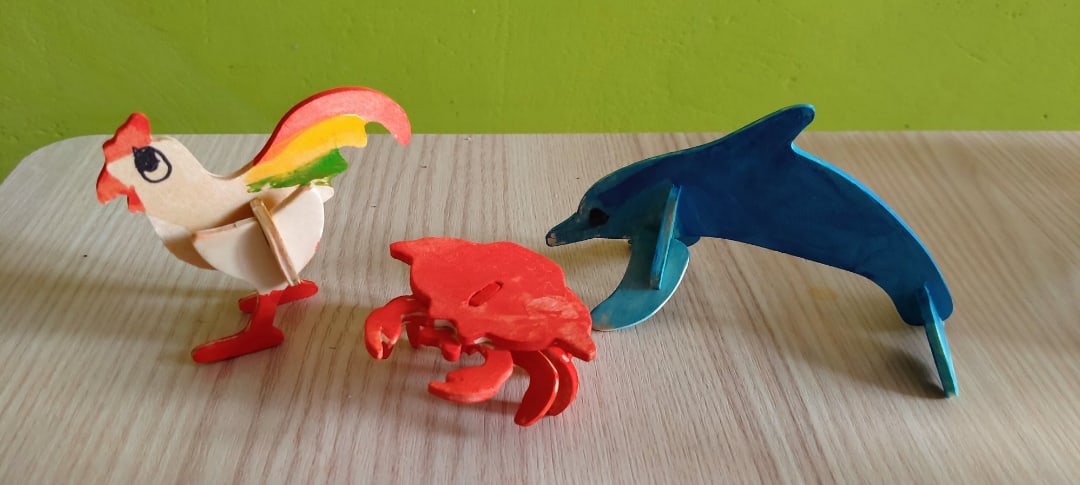 Сборка очень проста. Раскладываем на столе элементы, сопоставляем части и стыкуем их между собой, ориентируясь на образец. Благодаря несложным манипуляциям мы получаем желаемый объект. Так как он не окрашен, то ребёнку предоставляется возможность проявить фантазию и воспользоваться красками на водной основе (гуашь, акрил) для придания фигурке нужного цвета. После покраски игрушку можно покрыть лаком.