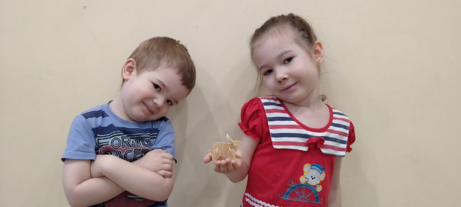 Для создания такой объемной игрушки дети сначала вытащили из основы все детали деревянного конструктора. Их немного, всего 7 штук. Инструкция очень понятная. Детали легко соединяются, детские ручки справляются. Но чтобы готовой игрушкой можно было играть, необходимо склеить все места соединения деталей клеем. Мы использовали для этого обычный ПВА.