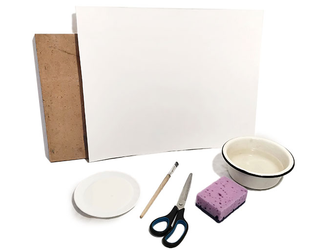 Попробуем закрепить бумагу на планшете. Для того, чтобы правильно закрепить бумагу на планшете нам потребуется: планшет - он должен быть меньше размера листа бумаги, если у вас нет планшета можно взять лист фанеры или твердый лист картона, толщиной -1,5-2 мм, а также бумага для акварели, губка, блюдце с водой, клейстер, ножницы.