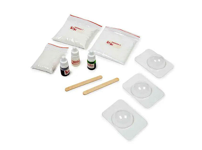 Состав набора: формочки - 3 шт., морская соль - 52,5 г, лимонная кислота - 87,6 г, сода пищевая - 178,6 г., краситель пищевой - 2 флакона по 5 мл, пищевой ароматизатор -1 флакон 5 мл, палочки для смешивания - 2 шт., перчатки - 1 пара, подробная инструкция.