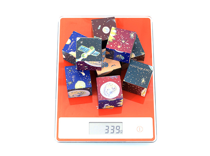 Игрушка кубики «AR Космос» упакована в лаконичную картонную коробка, с яркой этикеткой небольшого размера 19 х 18 х 6 см. Вес коробки с кубиками 430 гр. Игрушка, которую приятно держать в руках. Открываешь коробку и перед глазами предстают 9 кубиков и бумажная инструкции на отдельном листке по использованию приложения «AR Космос». Размер кубиков 4 х 4 см, вес кубиков от 36 до 42 гр. Кубики не просто лежат в картонной коробке, они лежат в специальном уплотнителе, чтобы при транспортировке меньше бились об друг друга, вроде бы мелочь, а такая забота о покупателе и гордость за свой продукт. Кубики выполнены из дерева, экологически чистые и безопасные, натуральные и главное долговечные.