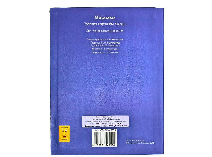 Русская народная сказка «Морозко» в твердом переплете предназначена для самых юных читателей. У книги отсутствует индивидуальная упаковка. На обратной стороне обложки присутствует вся необходимая информация о книге. Главный редактор А. В. Кошелева. Редактор М. Н. Пономарева. Художник Е. Ю. Ганаженко. Верстка Е. В. Нащанской. Корректор Е. П. Титученко. Книга входит в серию «Мои первые сказки». Издательство «Улыбка». Отпечатано ООО «Кубаньпечать». ООО «Флер». ISBN 978-5-88944-255-4. Материал: картон. Количество страниц: 10. Возрастное ограничение 0+. Размер книги 21,5х16,5х0,7 см.