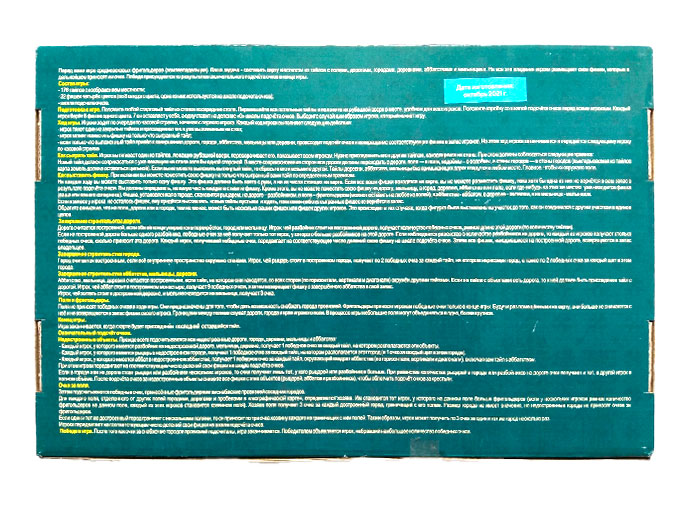 Комплектация игры: 176 тайлов с изображением местности; 32 фишки четырех цветов (по 8 каждого цвета, одна из них используется на шкале подсчета очков); шкала подсчета очков; игровое поле.