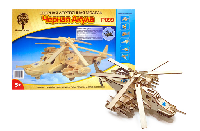 В комплект входят заготовки из фанеры с вырезанными деталями, инструкция, схема сборки, наждачная бумага, размером 4х4 см и рекомендации к сборке. Размер готовой модели составит 12х32х27 см. Набор упакован в термоусадочную прозрачную пленку. Под пленкой на лицевой части производитель поместил иллюстрированную цветную информационную листовку, где размещено изображение готовой сборной модели. На это изображение можно ориентироваться при сборке модели. Рядом с изображением деревянной модели есть фотография реальной модели вертолета «Черная акула» (как она выглядит в жизни) и краткая информация: «Черная акула – советский/российский одноместный ударный вертолет, предназначенный для поражения бронетанковой и механизированной техники, воздушных целей и живой силы на поле боя. Двухдвигательный одноместный вертолет с соосным расположением несущих винтов. Вертолет оснащен прямым крылом относительно большого удлинения и развитым вертикальным и горизонтальным оперением». На листовке справа мы видим шесть других моделей из серии «Авиация».