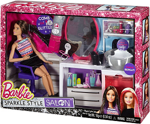 Компания предлагает два набора: куклу с тёмными и светлыми волосами. Косички, хвост, завивка – что выберешь ты? Создай блестящий образ для куклы Barbie®, добавь блёсток. А, если захочется придумать что-то новое, просто помой кукле голову в настоящей раковине с мылом или шампунем, расчеши волосы, и можно снова фантазировать! Всё как в самом настоящем салоне красоты!