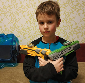 Одновременно с этим набором могут играть два человека. В принципе, если докупить дополнительные пистолеты и волчки, можно играть и более многочисленным составом. Кстати, с запуском волчков легко справилась и Федина младшая сестрёнка пяти лет! Радости детей не было предела! Теперь, даже спустя несколько месяцев, набор от Spinner Mad остаётся любимой игрушкой наших детей, чему мы и рады!