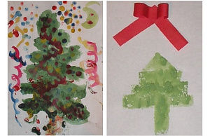 Конечно, нельзя обойтись и без поделок на новогоднюю тематику. Сделайте аппликации и рисунки про ёлочку, например, такие. Нарисуйте ёлку, а малышу предложите нарисовать пальчиком салют.
