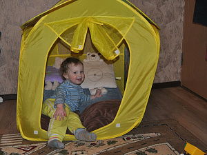Нашему малышу нет и двух лет, а он с удовольствием залезает в свой уютный домик, затаскивает туда свои любимые игрушки и играет. Иногда и нам приходиться по просьбе сына залезать в палатку, разглядывать вмести с ним сюжеты из знаменитого советского мультика «Винни-Пух». Рассказывать ребёнку про медвежонка-сладкоежку, про маленького поросёнка, умного зайку, учёную сову и несчастного ослика Иа, который сначала потерял, а потом нашёл свой любимый хвостик.