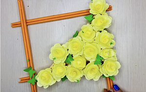 Вырежьте из цветной бумаги квадрат. Чтобы сделать его из листа формата А4, загните одну короткую сторону к длинной и отрежьте получившийся сбоку прямоугольник. Вам понадобится 8 таких квадратов. Затем каждый из них закручиваем в трубочку при помощи зубочистки. В итоге получается 8 трубочек, склеиваем клеем по две трубочки вместе. Потом формируем из заготовок рамку, где в дальнейшем будут располагаться розы.