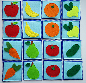 Сшитая нами игра будет крайне интересна малышам. С помощью фруктового «Мемори» можно не только развлечь ребёнка, но и научить его различать цвета и разделять такие категории, как овощи и фрукты, а потом придумать ещё массу сюжетно-ролевых игр с использованием этих карточек. Хорошего творчества вам и увлекательного развития вашему ребёнку.