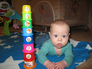 Пирамидка – это наш хит. Сынок обожает лежать и терпеливо наблюдать как мама или папа собирают пирамидку. А потом ударяет по ней кулаком и радуется, как она весело разлетается во все стороны. Не страшно, что порой стаканчик отлетает прямо в голову, он очень лёгкий и получается совсем не больно. Потом мы вкладываем стаканчик в стаканчик, и Лёва усердно вытряхивает получившуюся антипирамидку. В ванне он любит смотреть, как из отверстий на донышке стаканчиков льется водичка, из каждому по-своему! Ну и конечно же в ходе манипуляции с пирамидкой: схватить стаканчик, трясти его, кидать, грызть. Ещё одно развлечение – наблюдать, как из-под стаканчиков появляются любимые игрушки-погрызушки, как стаканчики выстраиваются в ряд. Несомненный игрушечный хит!
