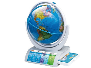 В комплекте к нему прилагается электронная ручка-указка. Прикоснувшись ею к любой точке на глобусе, он расскажет всё о стране, городе, его месторасположении, причастности к государству, о реках или морях, расположенных вблизи, о народах. В арсенале умного глобуса более 20 тысяч интересных фактов о континентах, океанах, 220 странах, истории, географии, животном и растительном мире. На его подставке расположена панель управления, с помощью которой выбирается тематика урока-игры, уровень сложности и режим. Вся информация разбита на 15 тематических категорий для удобства планирования последовательности обучения. Сфера глобуса вращается в двух плоскостях, благодаря чему не остаётся слепых зон и исследовать можно любую область земного шара.