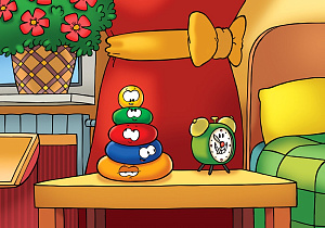 Внизу всегда было самое большое, жёлтое кольцо. Потом располагалось кольцо поменьше – синего цвета, потом ещё меньше – красное, и, наконец, зелёное – самое маленькое из колец. Завершал пирамидку жёлтый шарик. Иногда кольца шалили. Они рассыпались по всей детской комнате: валялись на полу, закатывались под стол. Могли даже спрятаться на кровати.