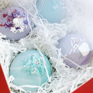 Красиво смотрится нанесение глазури косыми линиями - справа налево и обратно, однако, можно немного пофантазировать и создать свой неповторимый декор. Как только вы нанесёте глазурь, сразу посыпьте сублимированной ягодой, сахарными посыпками или кокосовой стружкой на выбор. Сверху можно добавить кандурин. Наша бомбочка готова! Положите её в кружку, залейте горячим молоком и наслаждайтесь увиденным!