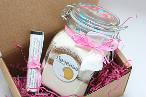 В подаренной вам банке слоями в определённых пропорциях насыпаны все необходимые ингредиенты. От вас требуется добавить только пару яиц и масло, согласно рецепту. Разложите получившееся тесто по формочкам или скатайте печенье, затем поставьте в духовку и ждите результат. Всё просто, и в то же время интересно. Справится даже ребёнок!Все ингредиенты в банках натуральные, никаких улучшителей вкуса и химии. Вы можете выбрать любые наборы для приготовления кексов и печенья. В нашем ассортименте есть кексы с лавандой, изюмом, с беконом, с цукатами, печенье брауни, чили, с клюквой и шоколадом, с m&m's и многие другие. В каждой коробочке есть свой рецепт. После выпечки баночку можно оставить для хранения, на кухне она будет хорошо смотреться.