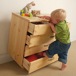 Всю мебель, которая гипотетически может упасть, нужно лишить такой возможности. Поэтому, готовясь к появлению малыша, позаботьтесь о том, чтобы комоды, тумбы и шкафы крепко «стояли на ногах», а в идеале и вовсе были прикручены к стенам. В помощь родителям производители уже выпустили системы «антиопрокидывания» для мебели и техники. Они представляют собой специальные фурнитуры или стальные уголки.