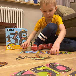 Суть игры следующая: каждому игроку раздаётся по 6 карт. Дальше по очереди все кидают по 2 кубика. При этом с помощью цифр на карточках нужно получить число, которое выпало на кубиках, путём сложения, вычитания, для более старших детей добавляется умножение и деление. Максимально можно сложить искомое число из трёх цифр, то есть трёх карточек, на которых они и нарисованы. Когда игрок скидывает все свои карты, считается победителем забега, в награду получает машину такси, автобус, или легковой автомобиль. Ну а потом? А потом начинается новый забег. В итоге тот игрок, который соберёт три автомобильчика, тот и лидер гонки. Мы довольно часто вечерами играем в Rallye всей семьёй, игра динамичная и весёлая. Всем рекомендуем!