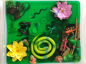 С приходом весны природа просыпается и всё вокруг оживает. Пруд - наглядное тому доказательство, ведь он населён невероятно огромным количеством насекомых и растений. А познакомить ребёнка с ними можно в очень интересной игровой форме – соорудить сенсорную коробку. Такая игра будет способствовать развитию мелкой моторки, воображения и подарит новый сенсорный опыт. Дети обожают возиться с водой, а с такой красотой вы точно надолго их увлечёте