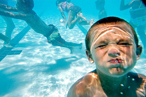 Ребёнок растёт, и в возрасте 2–3 лет у него появляется чувство страха, которое у многих детей проявляется в боязни воды. Помочь избавиться ребёнку от этого чувства вы можете с помощью всё той же игры. И детям и взрослым очень полезно бегать по воде. На мелкой воде, вы без труда можете организовать эстафеты, используя простое игровое оборудование — мячи, надувные и пластиковые игрушки, водяные пистолеты. Добавьте к игре элемент творчества — пусть дети придумают название своей команде и лозунг — азарт состязания не только естественным образом избавит ребёнка от страха, но и подарит ему море удовольствия и радости от пребывания в воде. Вы можете быть как арбитром, так и участником состязаний. Сначала располагайте эстафетную полосу вдоль берега, а когда дети освоятся, постепенно уводите её в направлении перпендикулярно берегу. Вероятность того, что малыш в азарте даже не заметит, что 2 метра он «бежал» не по дну, а по воде, достаточно высока. Обратите его внимание на этот факт уже после завершения игры и предложите на следующий день закрепить успех. Ещё один вариант игры на воде — водный волейбол или баскетбол. Организовать эти игры вы сможете с помощью специальных корзин или сетки, которые за счёт своей конструкции легко держатся на воде. Стоят они недорого, а удовольствия дарят много.