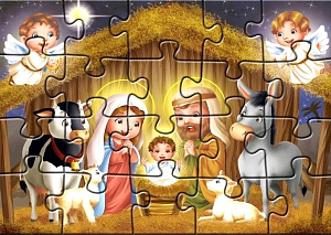 Для маленьких любителей головоломок предлагаем красочный пазл с сюжетом рождественской истории: Мария с Иосифом рядом с Младенцем. Дети без труда справятся со сборкой, ведь здесь всего 20 элементов, размер собранной картинки 19х24 см. В процессе сборки или после её завершения, расскажите ребёнку Библейское повествование, которое является сутью праздника.