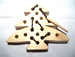 Итак, сегодня мы с вами сделаем шнуровки-предметы «Ботинок» и «Ёлочку». Цвет игрушки оставим натуральным. При желании вы можете покрасить игрушку. Сделать такую игрушку самому очень просто. Надо взять любую доску, нарисовать те предметы, что вы хотите сделать, и выпилить. Наметить и просверлить отверстия для шнурования. Затем хорошенько всё зачистить, скруглить все края, и игрушка готова.