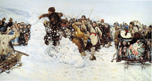 Одним из популярных праздничных состязаний было «Взятие снежного городка», или по-другому – «Снежная крепость». История происхождения этой русской забавы связана с покорением Сибири Ермаком. Первоначально это развлечение устраивал «служилый люд», а затем и сельская молодежь. Позже без этой игры уже не обходилось ни одно масленичное гуляние. Популярна эта забава была в Сибири, на Урале, в Пензенской и тульской губерниях. Увековечил это старинное русское развлечение русский художник В.И. Суриков в картине «Взятие снежного городка».