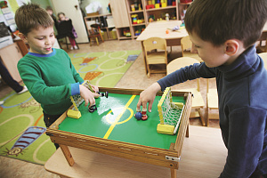 Этой теме в педагогических изданиях уделяется мало внимания. Между тем организовать содержательную двигательную деятельность детей на ограниченной площади всегда было проблематично. Мы решили эту проблему следующим образом: оборудовали стадион на столе с помощью четырёх настольных игр — «Рыбалка», «Дуэльный футбол», «Воздушный десант», «Дуэльный баскетбол».
