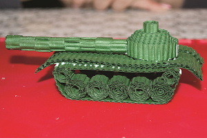 - Готовую пушку приклеиваем на нижнюю полоску башни. После этого башню с пушкой приклеиваем на корпус танка.