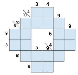 Тем, кто не знаком с этой замечательной игрой, напомним, что игровое поле какуро представляет собой набор клеток (на рисунке выделены), которые необходимо заполнить цифрами от 1 до 9 (цифра 0 не используется) согласно определённым правилам. Горизонтальный или вертикальный ряд последовательно расположенных клеток образует блок. Сумма цифр, входящих в каждый блок, записывается в клетке-подсказке: для горизонтально расположенного блока — слева от него, для вертикального — сверху. Если суммы цифр для двух блоков записаны в одной клетке, то они разделяются косой чертой: при этом левое число обозначает сумму всех цифр, входящих в вертикально расположенный блок, а правое — сумму всех цифр, входящих в горизонтальный. И последнее, очень важное правило: в каждом блоке не должно встречаться одинаковых цифр. Если наше последнее занятие окажется для вас слишком трудным — не отчаивайтесь! Почитайте предыдущие номера, и вы во всём разберётесь.