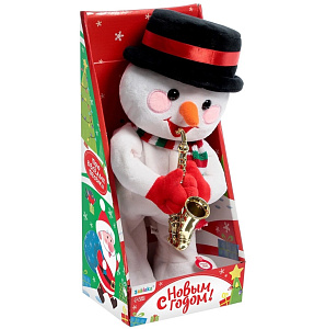 Милая игрушка с весёлыми глазами с первого взгляда настраивает на позитивный лад. Продаётся она в коробке-витрине, дизайн которой выполнен в новогоднем стиле. Снеговик, как и полагается, белого цвета. В отличие от фигуры из снега, у игрушки есть подвижные ноги и руки, а сделан он из мягкого плюшевого материала. Привычной осталась только круглая голова, с неизменной морковью вместо носа и румяными розовыми щеками. Ведро заменила модная шляпа чёрного цвета. Безусловно, танцевать с ней куда безопаснее, чем с жестяным ведром на голове. На шею повязан полосатый вязаный шарф, а руки, которые держат блестящий саксофон, заботливо спрятаны в красные перчатки.Игрушка достаточно большая, 11х10х33 см, для демонстрации всех умений нужны 3 батарейки типоразмера AA, которые не входят в комплект. Производитель выбрал весьма интересное место, чтобы разместить элементы питания – в подошве ног снеговика. Теперь можно включить кнопку, которая находится на ноге.