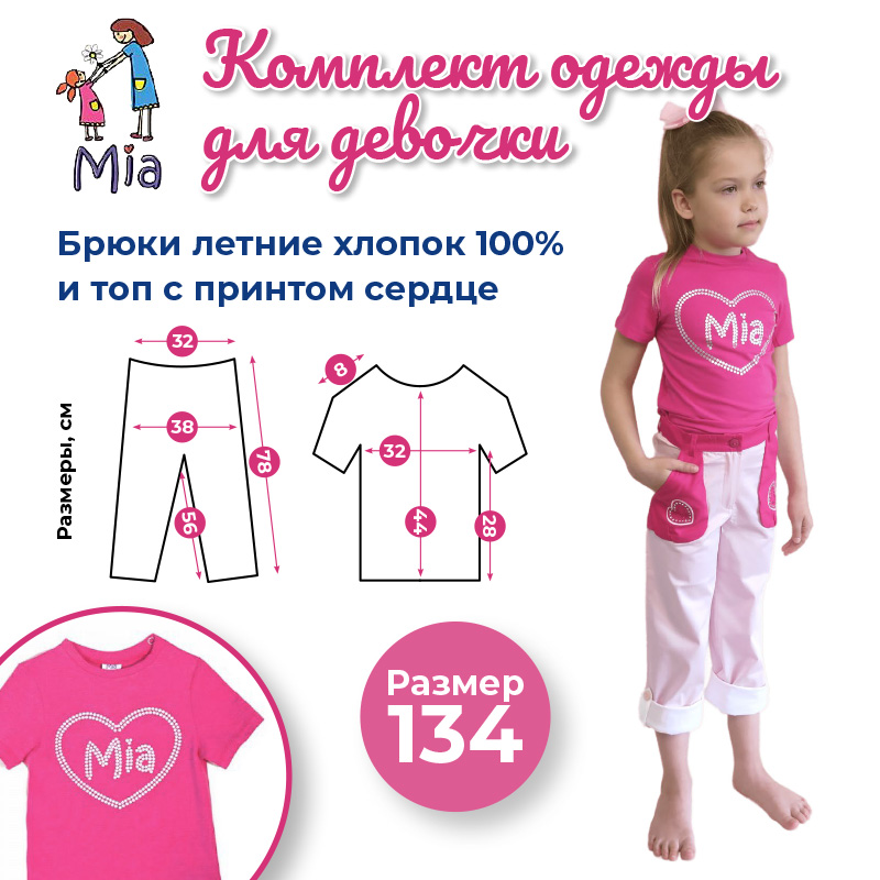 В комплект Mia входит футболка цвета фуксия с коротким рукавом и серебристым принтом в виде сердца, и летние брюки розового цвета с контрастными элементами.