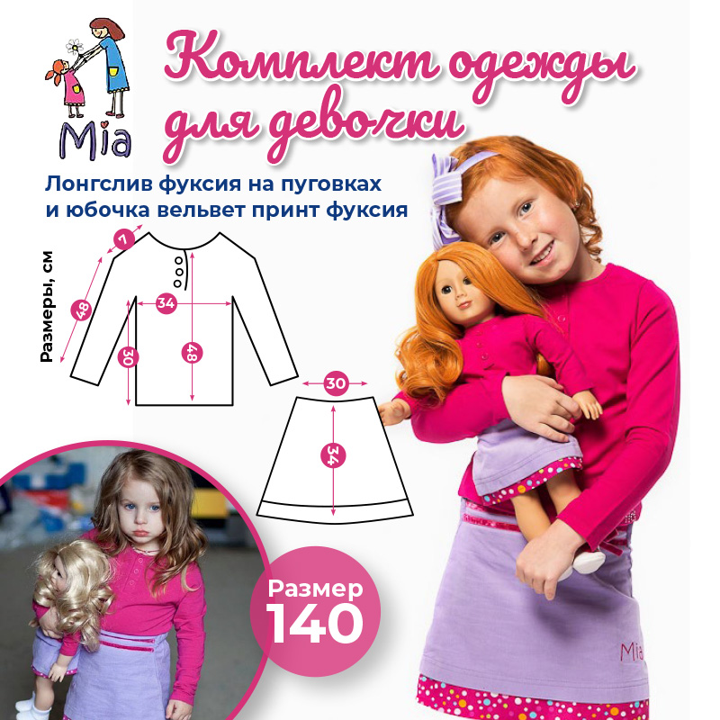 В комплект одежды Mia входит: лонгслив фуксия на пуговках и юбочка вельвет с принтом фуксия.