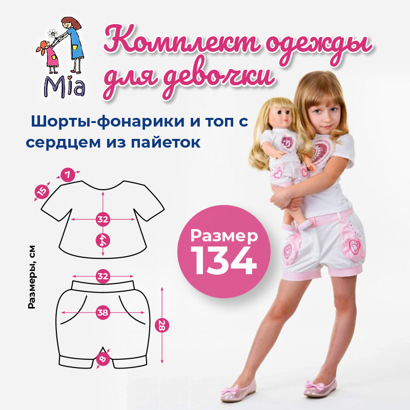 Комплект одежды Mia для девочки состоит из топа белого трикотажа с нежно-розовым сердцем из пайеток и шорт-фонариком, украшенных сердечками. Девочки очень любят подобные украшения на одежде.