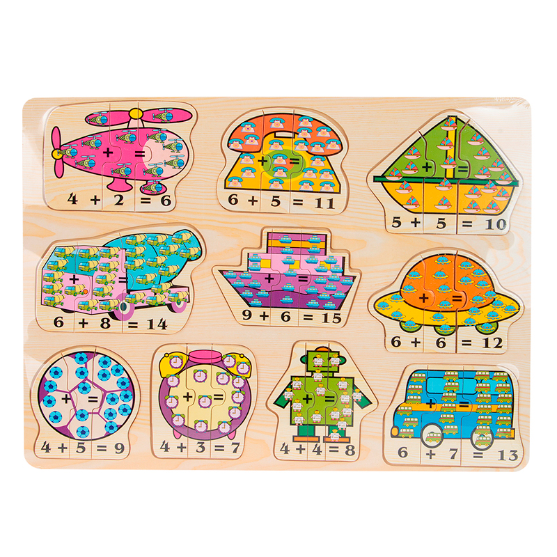 «Арифметические пазлы» полностью изготовлены из экологически чистой древесины, которая не содержит формальдегид. Размер одной рамки 30 х 40 см. В каждой рамке по десять вкладышей, состоящих из трёх пазлов каждый. Яркие и интересные картинки с изображением транспорта (как наземного, так водного и воздушного), фруктов и овощей, животных, бытовых вещей и игрушек, обязательно понравятся как мальчикам, так и девочкам. Игровые занятия по изучению цифр и простых математических действий помогут детям подготовиться к школе. Они получают в игре новые знания и при этом разносторонне развиваются. «Арифметические пазлы» – многофункциональная игра. С ними можно изучить название предметов, цвета, формы, счёт, ведь внутри каждой картинки есть маленькие изображения большого предмета. Собирая большую картинку, ребёнок решает простые математические задачи. Помимо рисунка, на пазлах написаны цифры и математические знаки. С помощью них малыш решает примеры, и помогает ему в этом картинка и сама рамка-вкладыш, а ещё пошаговая инструкция с изображением предметов.