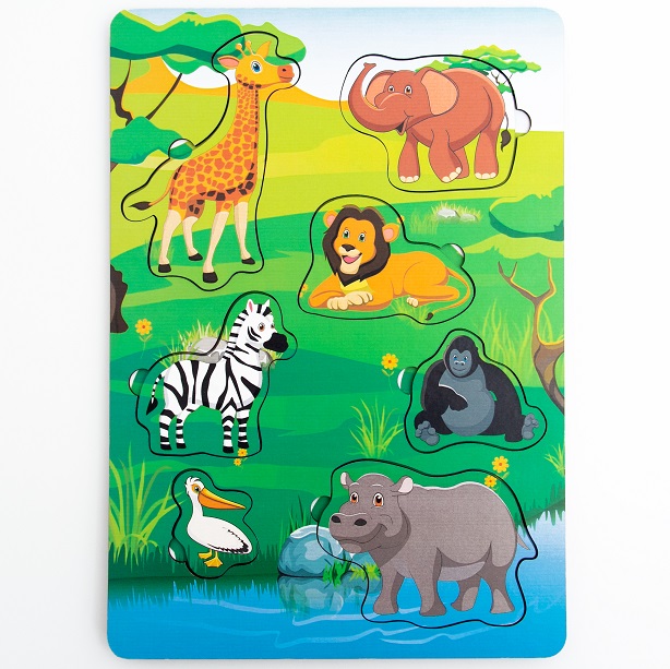 Деревянная панель с изображением природы саваны, диких животных и птицы в прорезях (жираф, слон, лев, зебра, горилла, бегемот, пеликан). С подслоями детенышей и питанием.